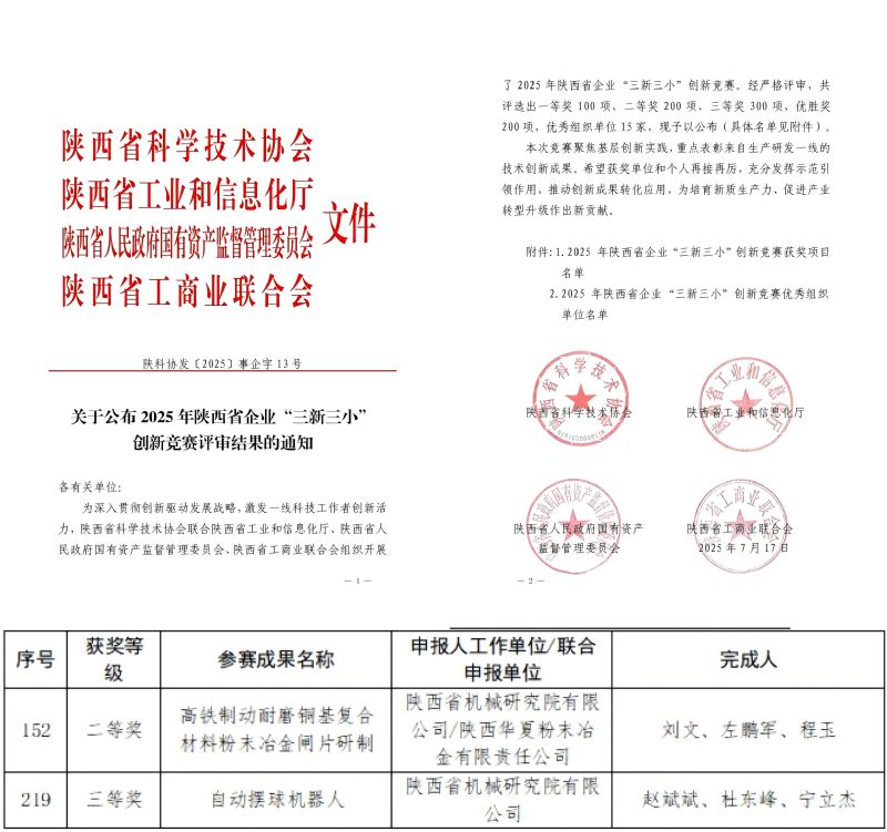 近日,由陜西省科協(xié)、陜西省工信廳、陜西省國(guó)資委、陜西省工商聯(lián)合會(huì)聯(lián)合舉辦的陜西省“三新三小”創(chuàng)新競(jìng)賽評(píng)選結(jié)果正式揭曉。我院參賽的“高鐵制動(dòng)耐磨銅基復(fù)合材料粉末冶金閘片研制”獲二等獎(jiǎng),“自動(dòng)擺球機(jī)器人”獲三等獎(jiǎng)。